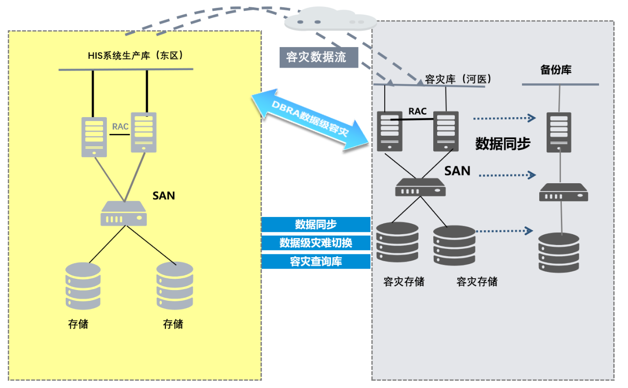 首先在河醫院區數據中心建立HIS系統oracle 11g數據庫,并將鄭東院區數據遷移至河醫院區,完成后把業務系統切換到河醫院區,由河醫院區暫提供對外業務。