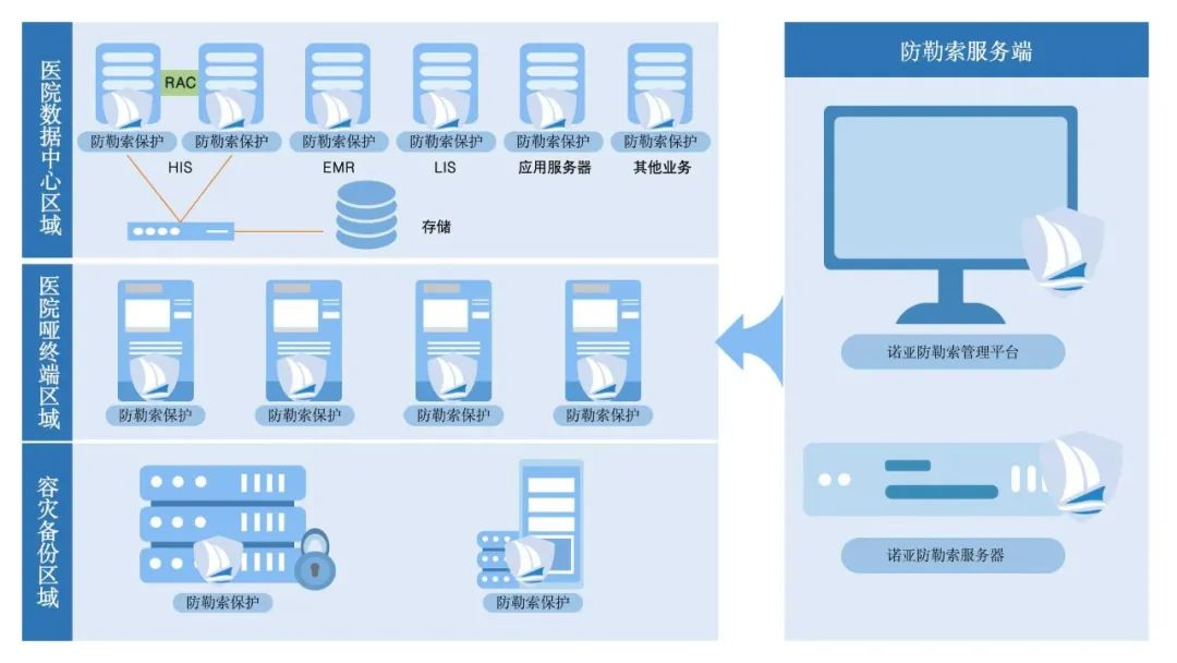 為滿足醫院信息安全建設需求,有效防范勒索病毒可能帶來的安全風險問題,美創科技按照統籌資源、重點保護、適度安全的原則,結合各安全區域實際情況,推出了以“諾亞防勒索系統”為主的事前防御解決方案,從源頭徹底解決勒索病毒問題。