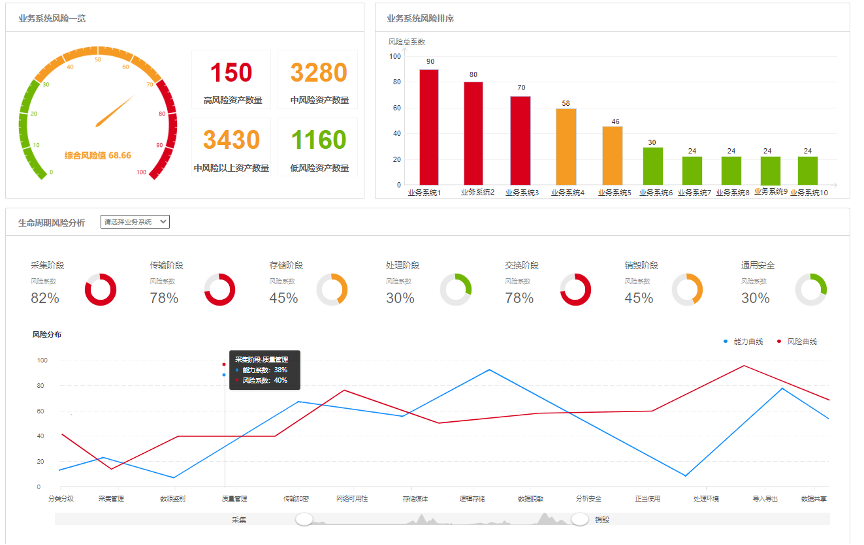 針對(duì)單位組織數(shù)據(jù)生命周期各階段活動(dòng),數(shù)據(jù)安全綜合評(píng)估系統(tǒng)可依據(jù)前置數(shù)據(jù)采集和分析結(jié)果,自動(dòng)完成生命周期各階段的風(fēng)險(xiǎn)分析,生成數(shù)據(jù)資產(chǎn)的全面風(fēng)險(xiǎn)清單和風(fēng)險(xiǎn)預(yù)估,同時(shí)評(píng)估完成后可自動(dòng)形成可視化報(bào)表,如下圖所示: