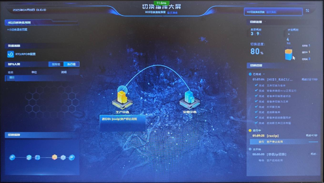 4月19日,一場(chǎng) HIS 系統(tǒng)數(shù)據(jù)庫(kù)跨院區(qū)一鍵應(yīng)急切換演練在溫州醫(yī)科大學(xué)附屬第一醫(yī)院順利開(kāi)展,演練全程自動(dòng)化、業(yè)務(wù)數(shù)據(jù)零丟失、醫(yī)院秩序井然,最終以7分鐘正切、3分鐘回切的極限速度,順利達(dá)成年度演練目標(biāo)。