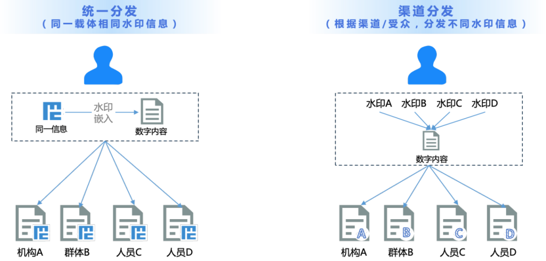 數(shù)據(jù)泄露追蹤溯源:通過為所有溯源對(duì)象(分發(fā)渠道、數(shù)據(jù)處理人員等)設(shè)計(jì)各不相同的水印信息,如果某個(gè)渠道/人員發(fā)生了數(shù)據(jù)泄露事件,在獲取泄露版本后,內(nèi)容擁有者可以通過提取版本中對(duì)應(yīng)的水印信息來定位到對(duì)應(yīng)的泄露渠道/人員,并根據(jù)需要來進(jìn)行追責(zé)等處置;