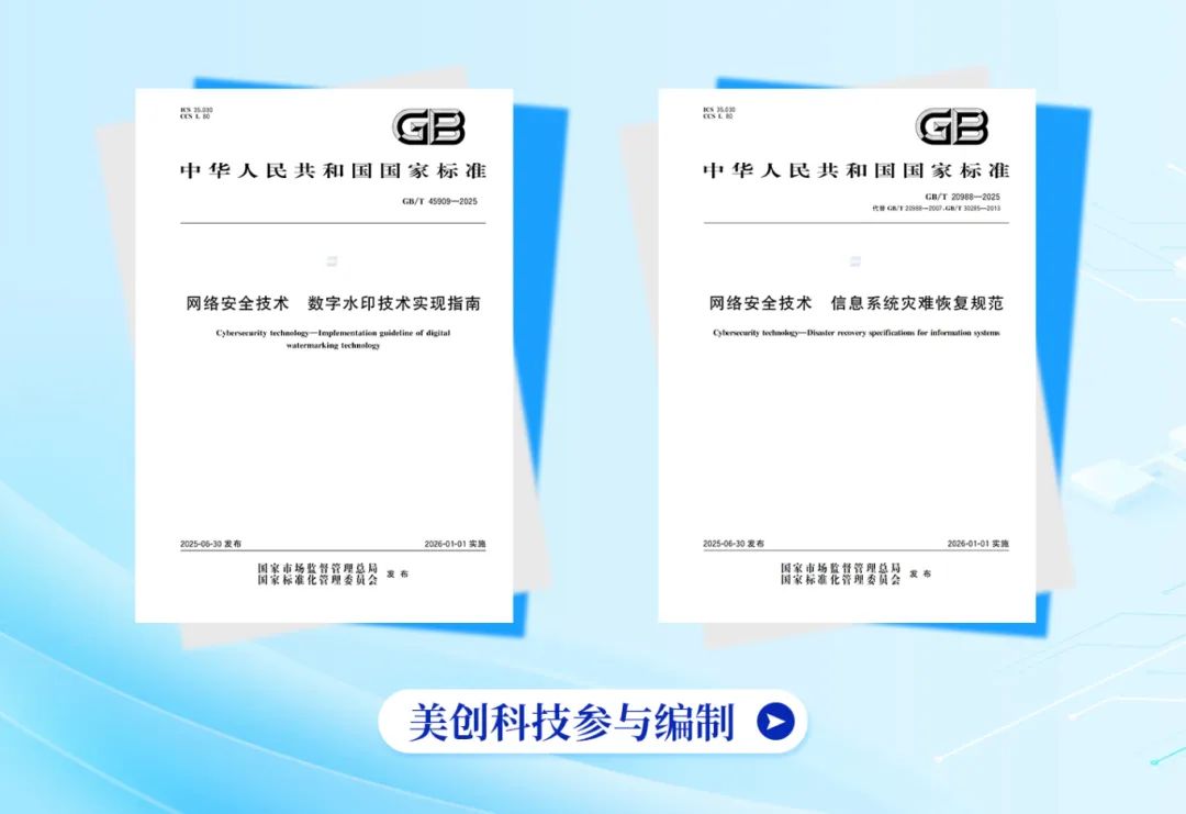 數據出境安全治理服務 數據安全能力評估認證服務 數據安全風險評估服務 數據安全治理咨詢服務 數據分類分級咨詢服務 個人信息風險評估服務 數據安全檢查服務美創科技深度參與編制的兩項國家標準GB/T 20988-2025《網絡安全技術 信息系統災難恢復規范》、GB/T 45909-2025《網絡安全技術 數字水印技術實現指南》,于2025年6月30日正式發布,并將于2026年1月1日起正式實施。