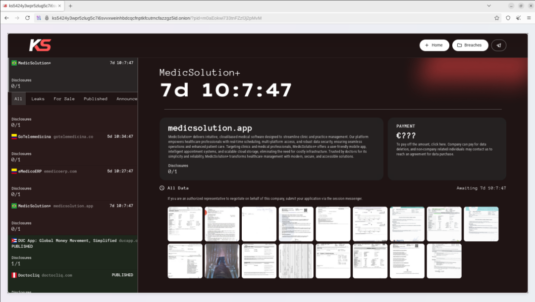 2025年9月8日,KillSec勒索組織聲稱對巴西醫(yī)療行業(yè)軟件解決方案提供商MedicSolution發(fā)動了網(wǎng)絡(luò)攻擊。泄露的數(shù)據(jù)總量超過34GB,包含超過94818個文件,包括:醫(yī)療評估、醫(yī)學(xué)實驗室結(jié)果、X光片、未經(jīng)處理的患者照片(包括顯示身體部位的照片)、與未成年人相關(guān)的記錄。研究人員發(fā)現(xiàn),泄露的數(shù)據(jù)文件屬于巴西當(dāng)?shù)氐尼t(yī)療機構(gòu)和醫(yī)學(xué)實驗室,包括但不限于Vita Exame、Clinica Especo Vida、Centro Diagnostico Toledo、Labclinic、Laboratório Alvaro等。