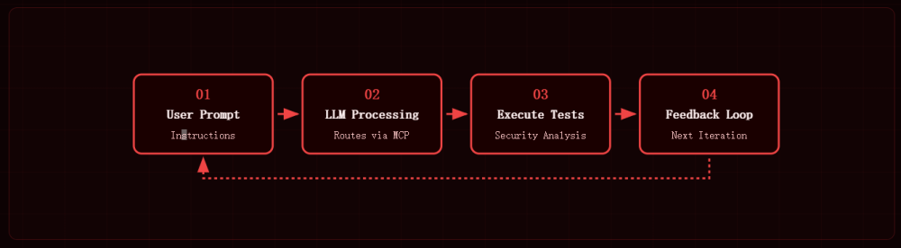 HexStrike AI 是一個(gè)革命性的人工智能驅(qū)動(dòng)的進(jìn)攻性安全框架,它將專業(yè)安全工具與自主人工智能代理相結(jié)合,提供全面的安全測(cè)試能力。HexStrike AI基于多代理架構(gòu)構(gòu)建,利用智能決策、實(shí)時(shí)漏洞分析和先進(jìn)的自動(dòng)化技術(shù)徹底改變安全專業(yè)人員處理滲透測(cè)試、漏洞賞金狩獵和 CTF 挑戰(zhàn)的方式。HexStrike AI的工作原理是通過(guò)MCP與外部LLM進(jìn)行人機(jī)交互,形成提示、分析、執(zhí)行和反饋的連續(xù)循環(huán)。其工作示意圖如下