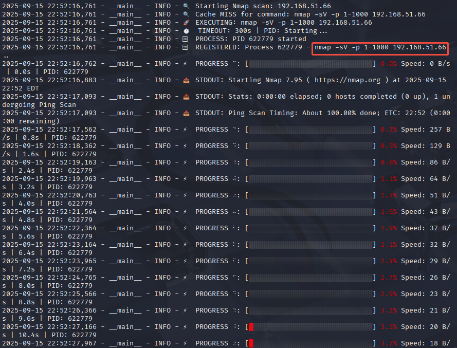 查看MCP server中的日志,發(fā)現(xiàn)其執(zhí)行了nmap -sV -p 1-1000 192.168.51.66命令來(lái)完成掃描任務(wù)