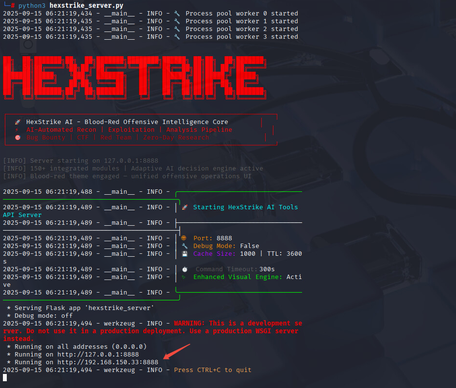最后運(yùn)行hexstrike_server.py腳本,完成hexstrike MCPs服務(wù)端的搭建啟動(dòng)工作