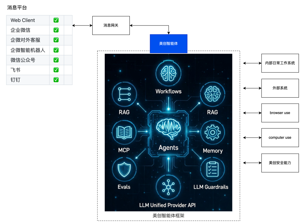 美創(chuàng)智能體框架不僅支持多種大模型統(tǒng)一調(diào)用,還實(shí)現(xiàn)了企業(yè)級安全、可控、可評估、可落地的完整閉環(huán),是我們所有AI員工的“操作系統(tǒng)”與“數(shù)字神經(jīng)網(wǎng)絡(luò)”。